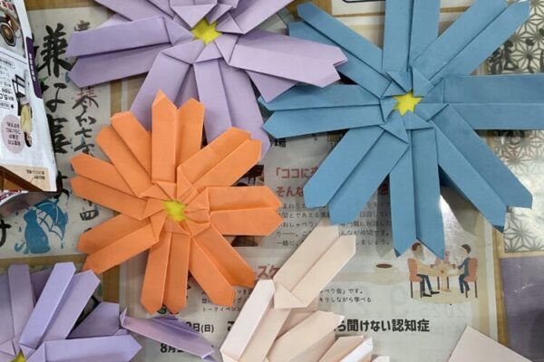 デイケアでは毎月折り紙作品を作っています! 今回の折り紙は、コスモスを折りました!! 花びらを1枚ずつ折っていき、 8枚で1つの花が完成します! 中心に黄色の折り紙を貼り付けることで、よりコスモスらしさが...